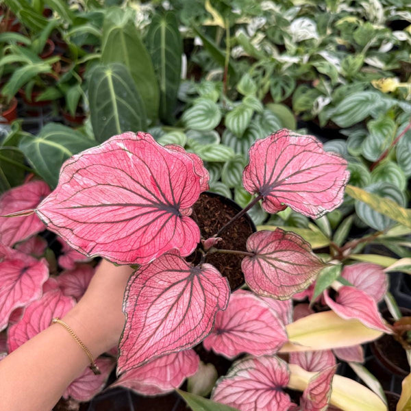 Caladium 'Peach Juice' – A stunning and rare caladium variety with soft peachy-pink leaves, accented by delicate green edges and subtle veining. Its pastel tones bring a warm, tropical glow...