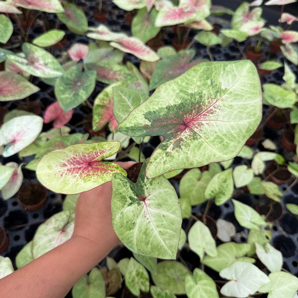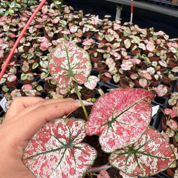 The Caladium 'Lucia' is a stunning and vibrant ornamental plant known for its eye-catching, heart-shaped leaves. These leaves are a beautiful combination of white, pink, and green, with deep veins...