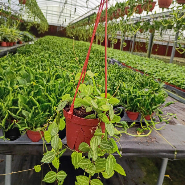Dischidia ovata 'Watermelon: Leaves: Succulent and oval-shaped, with a pattern reminiscent of watermelon rind (deep green with darker veins). Growth: Vining or trailing, ideal for hanging baskets; grows quickly. Light:...