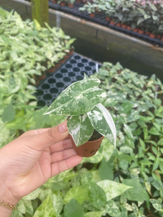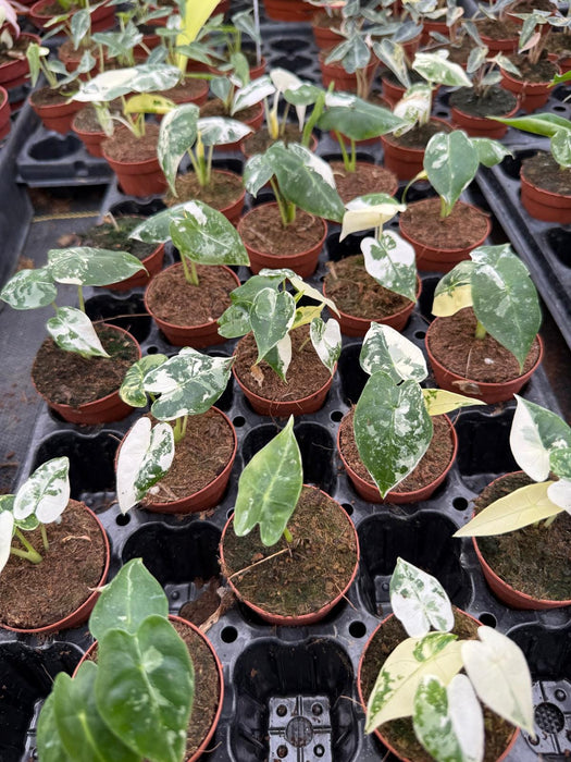 Alocasia Frydek Variegata is a rare and stunning house plant. It has rich deep greens, grays, and whites. Boasting sectoral and splash style variegation, and arrow heart-shaped velvety leaves with white venation. The length of the petioles Depends on how much or little light you provide your plant.