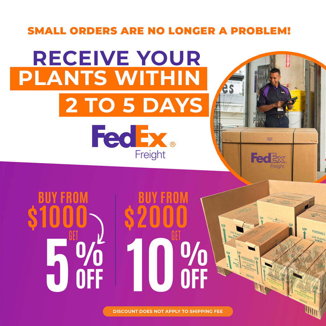 Thanks to our greenhouse operations, we offer a wide variety of indoor plants shipped directly to you. With nationwide coverage in most states, we ensure a smooth process from order placement to delivery. For orders with a minimum of one pallet, we provide FedEx Flat Rate shipping, ensuring delivery within 2 to 5 business days via ground shipping.