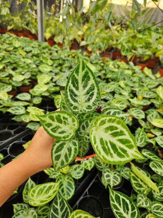 Anthurium Dorayaki is a hybrid plant of Anthurium Crystallinum. It is a tropical plant that is native to South America and often grown as a houseplant. It has dark green leaves with a heart-shaped pattern and white veins. The name 'Dorayaki' comes from a Japanese dessert that resembles the shape of the leaves. It is a pricey yet simple plant that is suitable for hanging baskets
