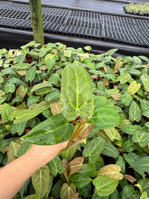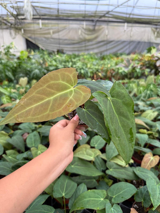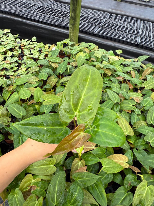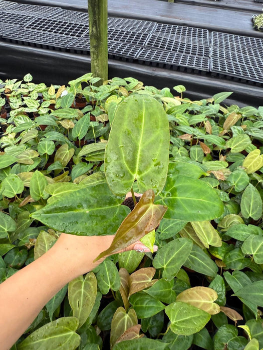 The *Anthurium Red Crystal* x *Crystallinum* is a striking hybrid with glossy, dark green leaves and vibrant red or white veins. It combines the velvety texture of *Crystallinum* with the colorful veins of *Red Crystal*, creating a stunning tropical plant. Preferring bright, indirect light and high humidity, this beauty thrives in well-draining soil and regular watering. Perfect for adding a touch of elegance to your collection! 🌿✨