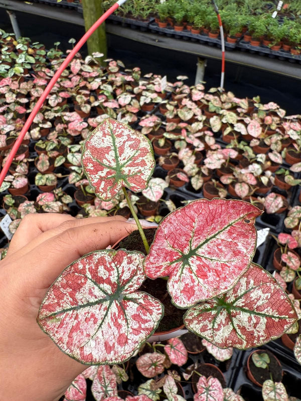 The Caladium 'Lucia' is a stunning and vibrant ornamental plant known for its eye-catching, heart-shaped leaves. These leaves are a beautiful combination of white, pink, and green, with deep veins running through, creating a striking contrast. The Lucia variety tends to have larger, more pronounced pink hues compared to other caladiums, making it a favorite among plant enthusiasts. It thrives in bright, indirect light and prefers a humid environment. Like other caladiums, Lucia should be kept in well-draining soil and watered regularly, but be sure not to let the soil become soggy. It’s an excellent choice for adding a touch of tropical flair to indoor spaces or shaded outdoor areas.