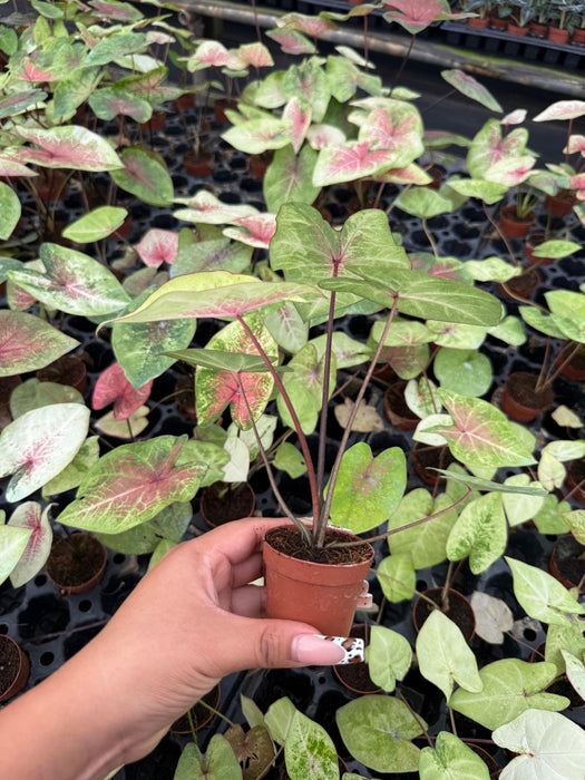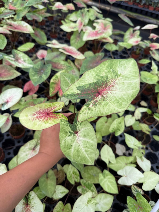 Caladium 'Peach Juice' – A stunning and rare caladium variety with soft peachy-pink leaves, accented by delicate green edges and subtle veining. Its pastel tones bring a warm, tropical glow to any plant collection—perfect for indoor pots or shaded gardens.