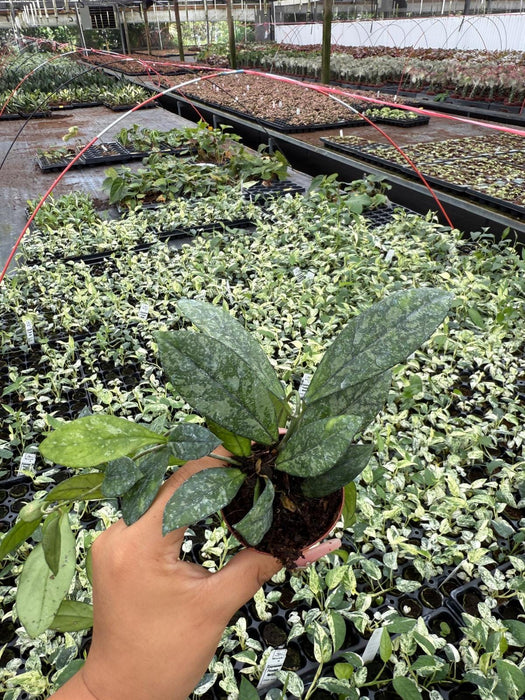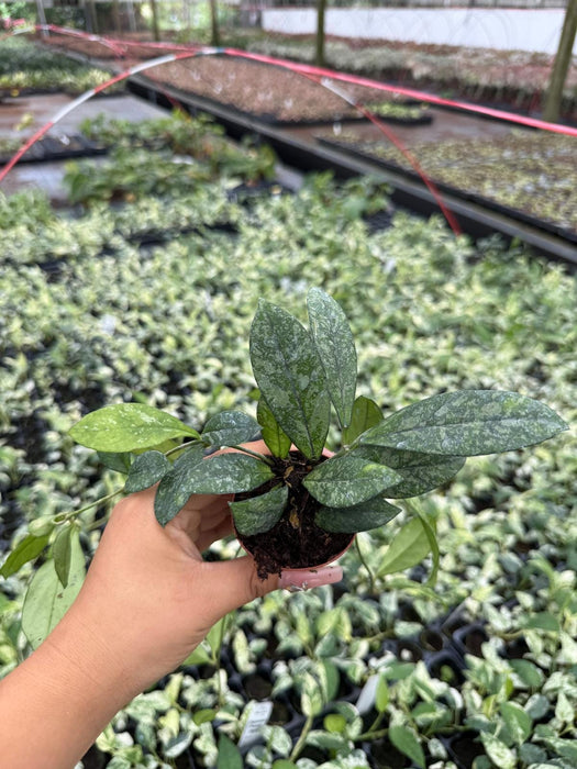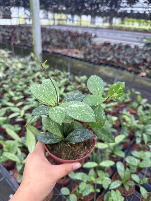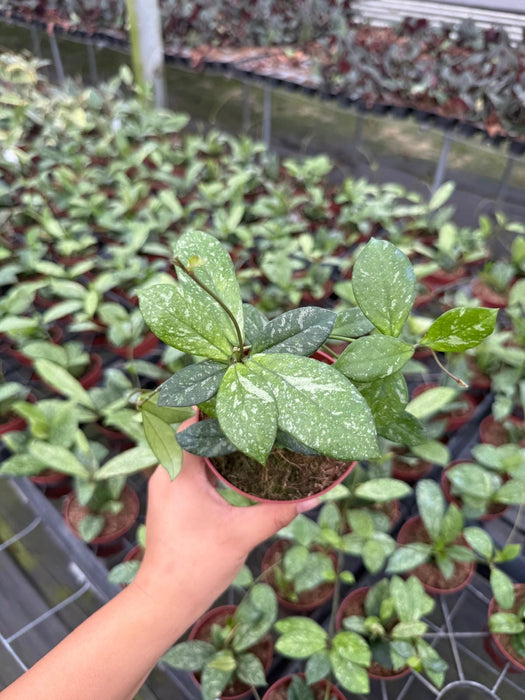 Hoya crassipetiolata 'Splash' is a tropical climbing plant known for its thick, green leaves with silver splashes. The leaves have a fleshy texture and marked veins, making it highly attractive. It's easy to care for, ideal for indoors, and with good light, it can produce fragrant star-shaped flowers.